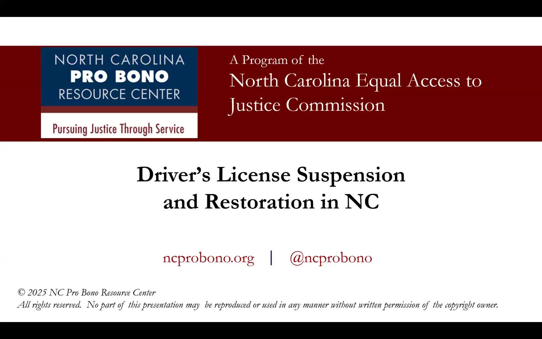 Know Your Rights Workshops Skip to Videos All | Immigration | Housing | General | Finances | Family | Family, Wills and Estate January 2026 Family, Child Abduction January 2026 General, Driver's License Suspension and Restoration in North Carolina November 2025 Housing, Good Cause Eviction March 2025 Finances, Managing Student Loan Debt August 2024 Family, Uncontested Divorce April 2024 Housing, Fair Housing Training October 2023 Immigration, Work Authorization for Asylum Seekers July 2023 Housing, Court Evictions - Desalojos March 2023 Immigration, Taxes and Immigration March 2023 Finances, Bankruptcy Process November 2022 Finances, Credit Repair and Financial Planning October 2022 Immigration, United States Immigration September 2022 General, Public Utility Law Project (PULP) June 2022